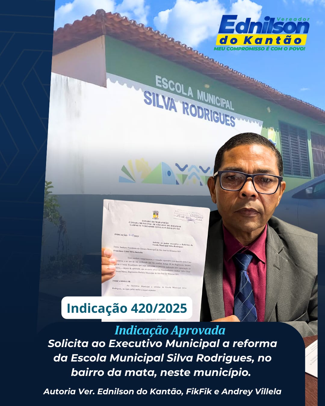 O vereador Ednilson do Kantão (AGIR) apresentou, na Câmara Municipal de São José de Ribamar, a Indicação nº 0420/2025, solicitando ao Poder Executivo Municipal a reforma da Escola Municipal Silva Rodrigues, localizada no bairro Mata. A proposição tem coautoria dos vereadores Andrey Villa e Fik Fik. Segundo o parlamentar,