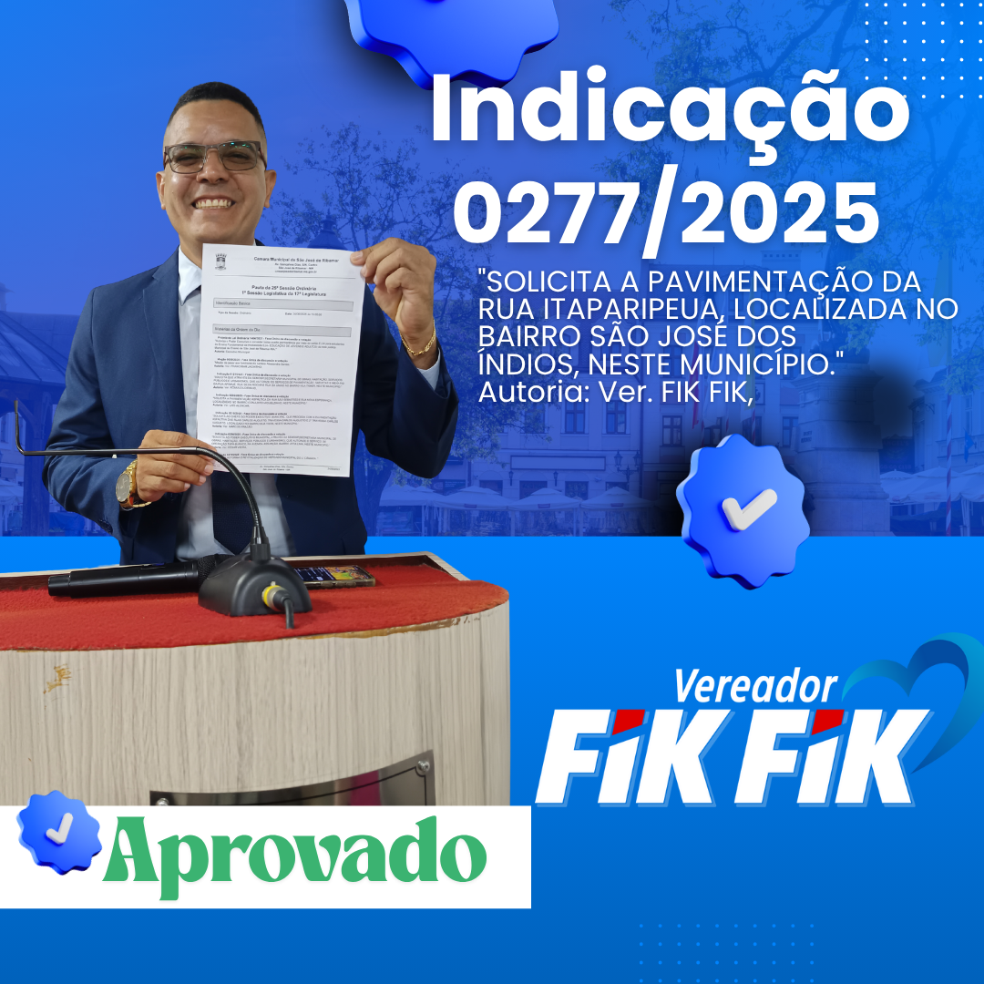 Durante a sessão legislativa mais recente, o vereador Fik Fik apresentou a Indicação nº 277/2025, solicitando a pavimentação da Rua Itaparipeua, situada no bairro