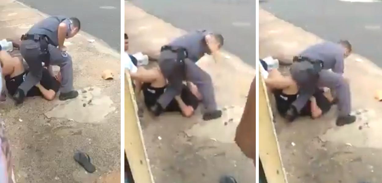 Com o joelho na barriga da mulher, que já estava no chão, o policial dá um tapa no rosto dela. O caso ocorreu na tarde desta terça-feira (4), em São José do Rio Preto (SP). Os PMs desconfiaram que ela estava gravando a abordagem policial. Filmar não é crime