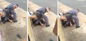 Com o joelho na barriga da mulher, que já estava imobilizada e no chão, o policial dá um tapa no rosto dela. O caso ocorreu na tarde desta terça-feira (4), na rua 19, que fica no bairro Santo Antônio. Grávida de cinco meses, ela ainda foi enforcada pelo pescoço.
